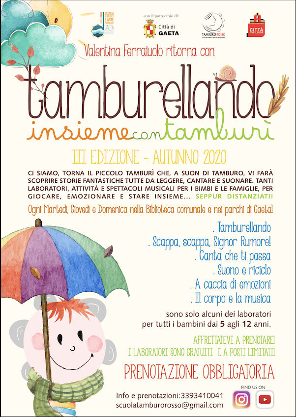 Il Tamburellando Insieme è un percorso formativo – musicale rivolto ai bambini e ragazzi delle scuole primarie e secondarie di Gaeta i quali oltre ai laboratori con esperti qualificati, vivranno l’esperienza del confronto e dell’esibizione con artisti ospiti che provengono da tutta Italia. Il fine è quello di evitare la dispersione scolastica musicale appena si chiudono le scuole e tenere i ragazzi dentro un clima artistico di cui si sentano non solo oggetti della formazione ma protagonisti di esperienze uniche. Saranno infatti i ragazzi la risorsa fondamentale per valorizzare il territorio e le tradizioni popolari.